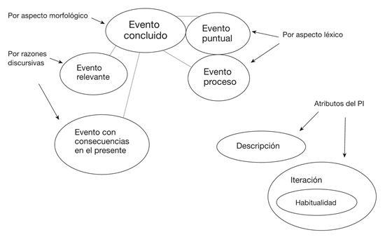 A partir de estos datos, observamos que el prototipo del PPS se compone de la combinación de atributos de “evento concluido” y “evento puntual”. Luego, por razones discursivas, también se usa para el “evento relevante” del relato. Suma el atributo “evento que implica un proceso” por influencia del Aktionsart (aspecto léxico). Por razones discursivas, pero con una frecuencia marginal, se usa para realizar una “descripción” (en combinación con “evento concluido”, “evento puntual” y, otras veces, con “evento que implica proceso”). En casos muy marginales, expresa “iteración” (por influencia del contexto gramatical, como en “sintió dos o tres fulgurantes puntadas”, en el cuento “A la deriva”, p. 72). También de modo marginal se usa para expresar “eventos que tienen consecuencias en el presente” (como en “Tuve razón: a las doce de la noche la llamada de un policía me citó al amanecer en las puertas del Museo”, de “La pieza ausente”, p. 90. El hecho de tener razón se continúa en el tiempo y da lugar a la cita en el Museo).