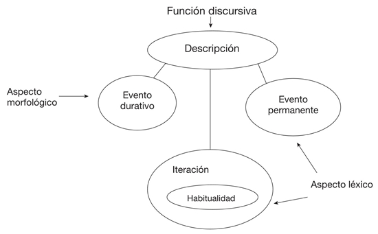 Los atributos “iteración” y “habitualidad” deben entenderse de manera conjunta, ya que la habitualidad se encuentra incluida en la iteración. Bertinetto (1986, pp. 162-181) distingue tres valores en el aspecto imperfectivo: el progresivo (“María estaba fregando el suelo”), el habitual (“Juan solía ir andando al trabajo”) y el continuo (“Marta iba diciendo tonterías”). En este trabajo, el progresivo y el continuo se denominan de forma indistinta como “evento durativo”, según vimos, en tanto que el habitual está escindido en iterativo y habitual, pues un evento repetido no supone necesariamente un hábito, pero sí a la inversa.