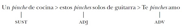 En los ejemplos de (1) y (2) vemos que pinche tiene la misma manifestación formal aun cuando ha cambiado de categoría. En (1) pinche es núcleo de frase nominal, en tanto que en (2a) forma una frase adjetiva y en (2b-c) es modificador de un sustantivo. En (3a) pinche ha dejado de guardar concordancia con el nominal que modifica y aparece antepuesto a un verbo, como se ve en (3b). Por último, en (3c), vemos que pinche puede tener afijado a su estructura el sufijo -mente, caracterizador de adverbios en español.