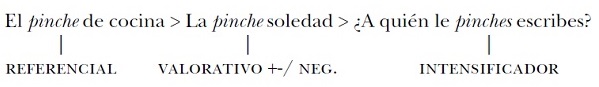 Por lo que respecta a los cambios semánticos de pinche, el Esquema 2, a continuación, muestra que esta palabra ha acumulado tres significados: uno referencial, otro valorativo (positivo y negativo) y uno de intensificación pragmática.