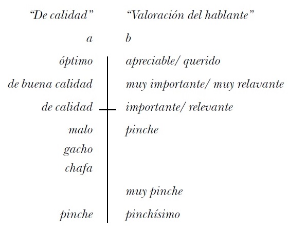 En los ejemplos de (16), el rasgo destacado por pinche está asociado a una norma de evaluación interna de cada hablante (Bally 1969, p. 1969, apud Kerbrat-Orecchioni, p. 114) que va del polo negativo al positivo por efecto de una recreación metafórica21. Esto es posible porque pinche se ubica en el extremo negativo de una escala de grado que mide la calidad de un objeto o la actitud del hablante hacia lo enunciado (véase infra, Esquema 3 a y b). Los sustantivos rolón y gráficos en (16) no presentan de manera consustancial22 la característica ‘de mala calidad’, sino todo lo contrario: son entidades valoradas positivamente por el hablante. Cuando el adjetivo antepuesto deja de resaltar las propiedades intrínsecas de los sustantivos que modifica, es decir, cuando debilita su capacidad descriptiva, gana fuerza pragmática (Paradis 2000, p. 4). Entonces, pinche es mucho más subjetivo en los ejemplos de (16) que en los de (14), porque la actitud del hablante frente a lo enunciado (una valoración positiva) ha encontrado codificación en pinche, adjetivo que facilita el mayor involucramiento del hablante en la expresión gracias a su naturaleza evaluativa y a su preferencia prenominal en la mayoría de los casos.
