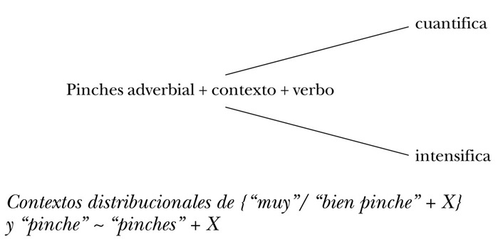 Tanto el binomio adverbial, formado por {muy/ bien + pinche}, como el adverbio pinche ~ pinches tienden a anteponerse a las unidades que modifican; no obstante, la incidencia sobre unidades diferentes sugiere que son adverbios distintos. Si fueran manifestaciones del mismo adverbio, los contextos distribucionales serían iguales; sin embargo, la propensión hacia determinadas unidades léxicas sugiere que estamos frente a dos adverbios funcionales con pinche, uno por binomio y otro que oscila entre pinche ~ pinches. Esta escisión categorial podría ser consecuencia del cambio de adjetivo a adverbio que está experimentando pinche en la actualidad.