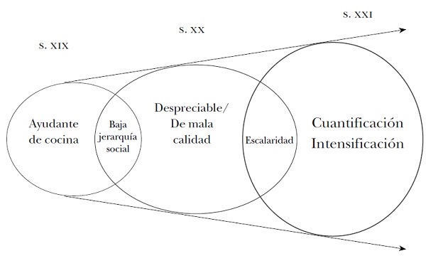 Esta investigación se sustenta en un corpus base y dos adicionales. El corpus base consta de 450 datos que provienen del Corpus diacrónico del español (CORDE) y del Corpus de referencia del español actual (CREA)5, de ejemplos extraídos de Internet (www.google.com) y de redes sociales (Facebook y Twitter, principalmente)6. Se trata de un análisis diacrónico que se centra fundamentalmente en el siglo XX y en los primeros doce años del siglo XXI7. Como veremos oportunamente, el reanálisis de sustantivo a adjetivo surge en contextos culinarios donde queda en evidencia la baja condición social del ayudante de cocina. Por lo demás, el rastreo de la ruta adjetivo > adverbio está restringido a contextos orales muy coloquiales; sin embargo, las nuevas maneras de interacción que ofrecen las redes sociales permiten que los hablantes se expresen y construyan la lengua de manera semejante a como lo hacen en la oralidad.