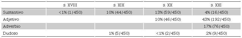 La presencia de pinche en relación con su uso categorial, desde su primera documentación en el siglo XVIII hasta llegar al siglo XXI, se muestra en el Cuadro 1. Según los datos analizados, pinche se encuentra en la categoría sustantiva desde que se tiene registro de esta forma en el español. Como he mostrado en este trabajo, el primer reanálisis de pinche empezó a gestarse muy posiblemente a principios del siglo XX. Recordemos que la obra de Santamaría (1942) ya registra el adjetivo pinche en México. La reinterpretación del sustantivo pinche en adjetivo debió generalizarse a finales del siglo XX, como sugiere el 10% de presencia del adjetivo pinche para este siglo. En el siglo XXI, el adjetivo gana prominencia (43%) y rebasa en número de apariciones a la categoría sustantiva. Por último, aparece un porcentaje representativo de ejemplos de pinche como adverbio (17%) y se elevan los casos dudosos, ejemplos en los que es poco claro si pinche funciona como adjetivo o como adverbio. Es interesante notar que durante la transición entre un reanálisis y otro (de sustantivo a adjetivo y de adjetivo a adverbio) el número de casos dudosos se incrementa casi en la misma proporción, como es esperable. En el caso del segundo reanálisis, la indeterminación categorial entre adjetivo y adverbio sugiere que la recategorización del adjetivo pinche en adverbio va camino a consolidarse.