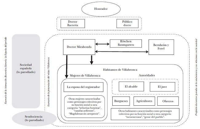 Presidiendo el Modelo contextual 1 (véase infra), situamos la interacción discursiva general, es decir, la que se establece entre el Doctor Bacteria, seudónimo del autor, y que identificamos como un narrador heterodiegético, y sus interlocutores previstos, los lectores cultos o “público docto”, a quienes menciona el autor en el prólogo e interpela en el propio relato. En el margen derecho del modelo contextual, indicamos el propósito comunicativo, o sea, la parodia de la seudociencia y de sus relaciones con la sociedad española. En el centro del modelo contextual situamos las representaciones sociales, con los siguientes criterios: arriba, lo dominante; a la misma altura del doctor Mirahonda, colocamos a los interlocutores con los que mantiene cierta relación entre pares; debajo están aquellos sobre los que ha establecido una autoridad seudocientífica; los individualizados priman sobre los categorizados grupalmente. Las puntas de las flechas indican el sentido de las acciones comunicativas del relato; con líneas discontinuas hemos recuadrado los grupos sociales implícitos en el texto, pero no explicitados aún por el autor. A la izquierda de las representaciones sociales indicamos el escenario imaginario, Villabronca. Lo parodiado se encuentra fuera de este imaginario del relato y forma parte de los saberes contextuales3: se trata de la sociedad española de la época y la seudociencia. En lo más alto del modelo contextual, situamos, finalmente, un valor social: la “honradez”.
