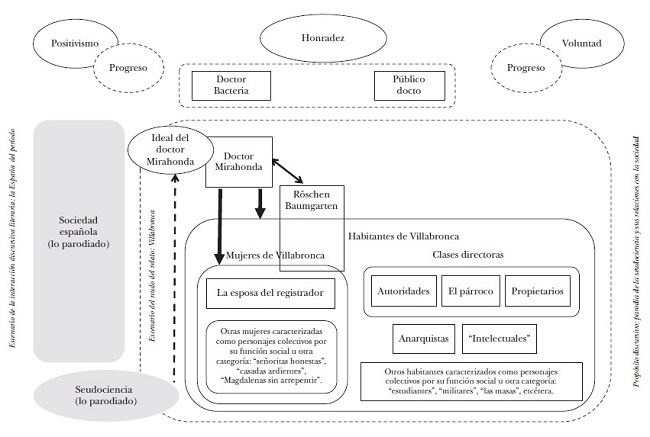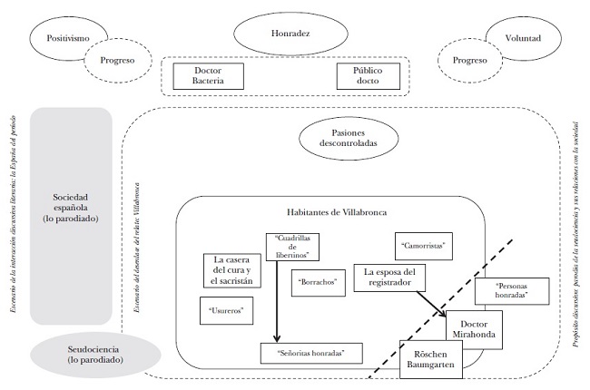 Este diálogo es significativo además porque nos permite distinguir con claridad dos sistemas diferentes de ideas: el uno gobierna las acciones del doctor Mirahonda y el otro la perspectiva del autor, lo cual explica la parodia. Al menos dos representaciones sociales se solapan: la del autor y la de los personajes. El diálogo apunta el modelo contextual del doctor Mirahonda, que está anidado en el modelo contextual del autor, el Doctor Bacteria, y que éste parodia.