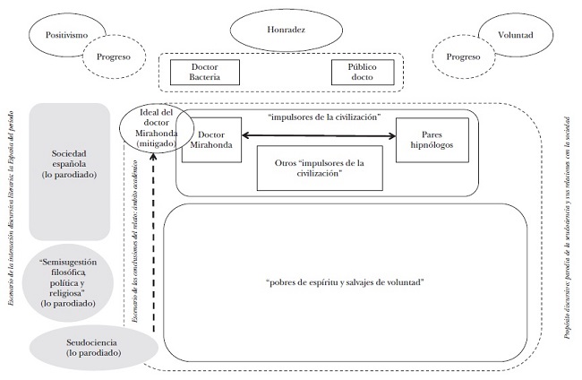 En el nudo del relato, el Modelo contextual 2 se enriquece con varias nociones culturales y varía en algunas representaciones. Modificamos la relación entre el doctor Mirahonda y Röschen Baumgarten. Añadimos en la franja superior el positivismo y la voluntad, además del valor social que implica el progreso. Las ideologías seudocientíficas que naturalizaban el dominio de raza o de género pueden incluirse en la seudociencia, en el ángulo inferior izquierdo, en cuanto sistemas de ideas parodiados; pero estas ideologías se convierten, según el imaginario del relato, en el “Ideal del doctor Mirahonda”, que gobierna su experimento.