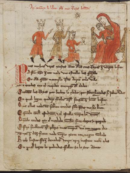 El carácter material de tal devoción se reconoce de manera privilegiada, según hemos planteado, en los objetos que se refieren a ella: desde las representaciones confluyentes visuales y textuales del folio manuscrito hasta las imágenes más destacadas asimismo en la miniatura o en el propio poema. Los dones que los Reyes Magos ofrecen a Cristo Niño, la estrella que los conduce a su encuentro, la Sagrada Escritura, el agua bautismal son todos elementos concretos que se distinguen por la preeminencia del sentido de la vista en la cultura medieval y que promueven simbólicamente la mediación de la doctrina cristiana; son objetos, en síntesis, que también dan cuenta de la confluencia de lo material y de lo espiritual, y de las particulares formas de intercambio que asumen en su carácter a la vez concreto y sagrado.