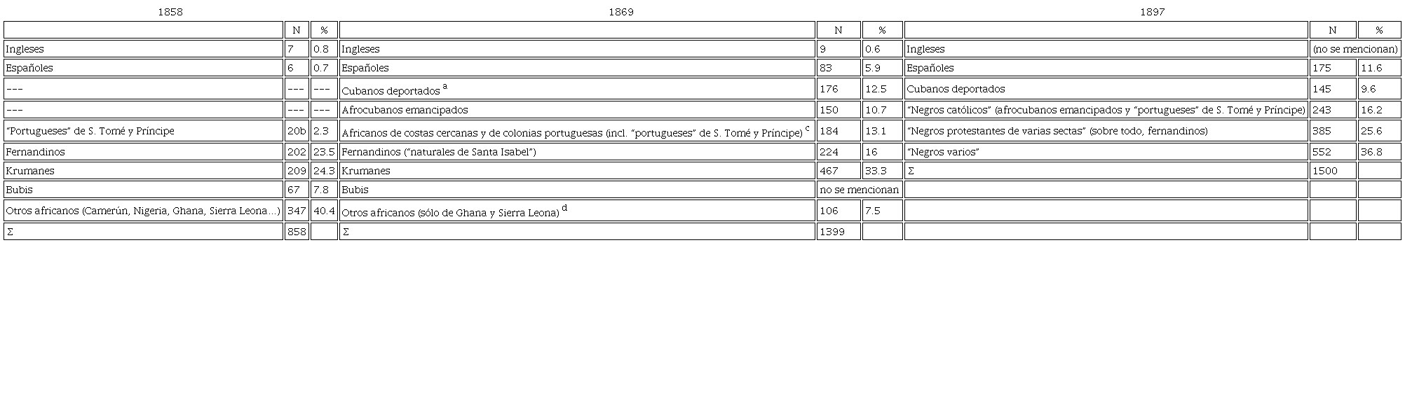 En esta época, la presencia hispánica se concentró en Santa Isabel, único asentamiento que cumplía la condición de ser estable (la sociedad fernandina llevaba décadas asentada allí) y relativamente numeroso, hasta el punto de sobrepasar los mil habitantes con la llegada de los afrocubanos (Irisarri 1862, p. 25; véanse censos infra, en Tabla 1). En claro contraste con esta situación, la empresa colonial aún no había incluido decididamente el resto de la isla durante el siglo xix, a pesar de algunos (débiles) lazos comerciales con la población indígena bubi y de algunas incursiones misioneras en el interior. A este respecto, es interesante rescatar un testimonio atribuido a los bubis del interior sobre los españoles (Baumann 1888, pp. 104-105):