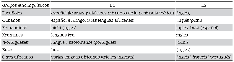 La Tabla 2 repasa esquemáticamente lo dicho a lo largo de este apartado y distingue entre L1 y L2. Bajo la rúbrica “L2” caben variedades muy distintas, más o menos reestructuradas (cf. Holm 2004 sobre reestructuración parcial), incluidos los pidgins. Entre paréntesis se indican las lenguas que formaron parte del repertorio de un número representativo de individuos, pero no de toda la comunidad correspondiente al grupo etnolingüístico; por último, cuando no se indica una lengua es por su uso marcadamente minoritario -o inexistente- en el repertorio de un determinado grupo: