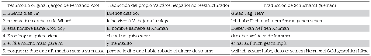 En gran parte, Schuchardt se basa en una carta (con fecha del 4 de marzo de 1883) de un tal Felipe Valcárcel, escribano e intérprete de Fernando Poo, que fue o bien un fernandino natural de la ciudad o bien, probablemente, un afrocubano asimilado a los fernandinos, de quien también se sabe que de joven había estudiado con los jesuitas24: se trataba, en cualquier caso, de un personaje bisagra entre el mundo fernandino y el español. Sobre todo, Schuchardt aprovecha un ejemplo de Valcárcel en el que imita el español de Fernando Poo. Aunque este testimonio no esté exento de cierta exageración, no hay ningún motivo para pensar que el informante fernandino quisiera engañar al lingüista alemán (al contrario, Valcárcel comienza su carta destacando la importancia de la investigación de Schuchardt y expresando su deseo de poder servirle de ayuda); más bien, cabe suponer que pretendía ayudarle a entender la compleja realidad lingüística de Fernando Poo, aunque para ello representara todas las informaciones lingüísticas en un solo ejemplo, el cual resulta, así, un tanto denso (que no necesariamente falseado). A continuación, copio el testimonio original, respetando la acentuación del manuscrito, e incluyo además la traducción al español no reestructurado del propio Valcárcel y la no menos interesante traducción de Schuchardt al alemán (1888, p. 243), basada en el original; para facilitar la comparación, numero las distintas frases que componen el texto.