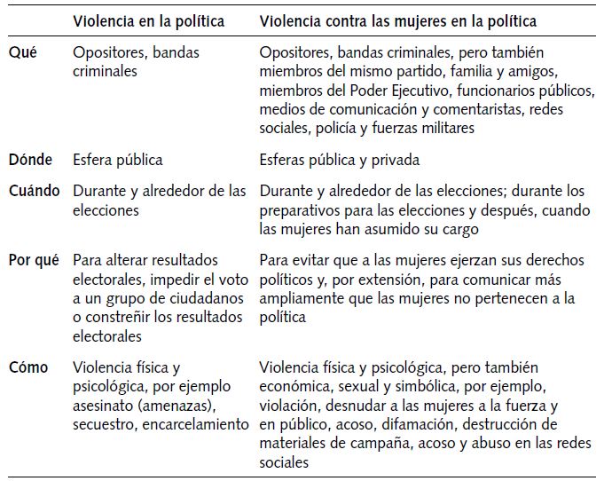 Para hacer este argumento más claro, la tabla 1 contrasta “violencia en la política” (un síntoma de altos índices de violencia en la sociedad) con la “violencia contra las mujeres en la política”. Lo que muestra la tabla es que mientras esta última se relaciona y comparte algunas características con la primera, hay diferencias cruciales entre los autores, espacios, motivaciones, tiempo y formas de violencia. Para Piscopo (2016), la violencia contra las mujeres en política se produce sólo en los espacios públicos, a manos de opositores políticos y delincuentes criminales; como tal, no es de extrañar que ella la confunda con la violencia en la política en general. Nuestra definición, que de hecho es compartida por las activistas e investigadoras que trabajan en este tema, hace hincapié en que estos actos pueden ocurrir tanto en espacios comunes como en espacios privados. Muchos, si no la mayoría, de los perpetradores son los compañeros de partido de las mujeres o miembros de su familia. El resultado es que, además de ser atacadas en ambientes inseguros, las mujeres también enfrentan peligro en espacios que son generalmente seguros para los hombres: asambleas políticas, eventos oficiales, sus oficinas y hasta sus propias casas.
