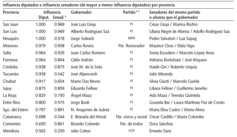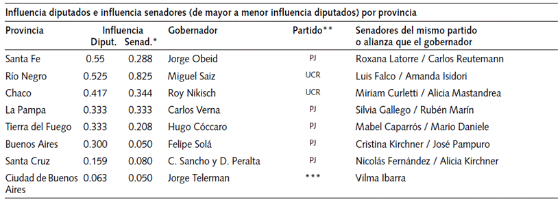 Estas cifras reafirman el mensaje que algunos casos bien conocidos sugieren: la pertenencia de un senador al mismo partido del gobernador no necesariamente implica afinidad o subordinación. Así, resulta claro que la senadora por la provincia de Buenos Aires Cristina Kirchner (esposa del presidente y futura presidenta ella misma) no respondía al gobernador Felipe Solá. La mera existencia de estos senadores “con peso propio” o dependientes de referentes políticos más poderosos que el gobernador (en particular el presidente), debilita la tesis de la subordinación.