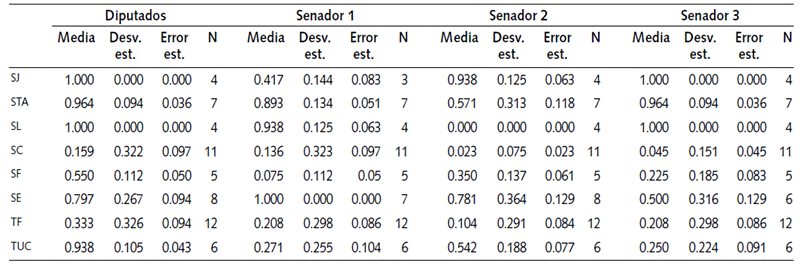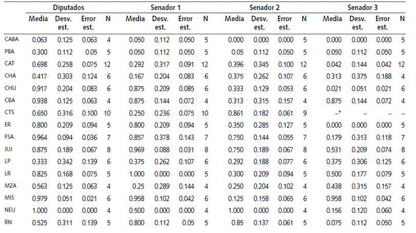 Con el objeto de permitir la agregación de las respuestas de todos los expertos de cada provincia se procedió a asignar a cada categoría un puntaje numérico en una escala del cero al uno, en el que cero significa “nada” y uno “mucho” (las tres categorías intermedias corresponden a 0.25, 0.5 y 0.75).10 El procedimiento de agregación consistió en calcular la media aritmética de las respuestas de todos los expertos a cada ítem. Esto significa que aunque nuestros datos originales corresponden a respuestas aportadas por los expertos en todas las provincias (N = 155 expertos), los datos que analizamos más abajo corresponden al nivel de las delegaciones de diputados oficialistas (N = 24; una delegación por provincia) o de los senadores oficialistas (N = 44, dado que en general hay más de un senador oficialista por provincia11). Así, por ejemplo, el grado en que la senadora X se subordinaba o no al gobernador Y surge del promedio de las entre cuatro y 12 respuestas obtenidas en su provincia.