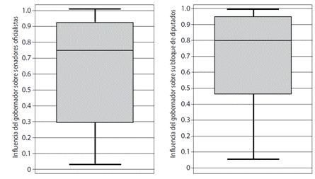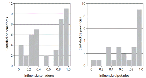 Una rápida inspección de estas cifras revela que, en promedio, los senadores oficialistas responden sólo parcialmente a los deseos de los gobernadores de sus provincias. La media de la variable Influencia Senadores es de 0.59, relativamente alejada del valor máximo de “mucha” influencia (1) y sólo levemente por encima del valor intermedio de “algo” de influencia (0.5). La variabilidad es muy alta, con valores mínimos de prácticamente cero12 y máximos de uno.13 La desviación estándar de 0.34 está más cerca del máximo teórico de 0.5 (en el que la mitad de las provincias obtienen un puntaje de 1 y la otra mitad de 0) que del mínimo teórico de 0 (en el que todas las provincias están exactamente en el promedio). Existen, entonces, senadores claramente subordinados a sus gobernadores pero también otros cuyo nivel de subordinación es moderado, escaso o incluso nulo.