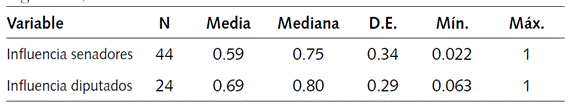 De esta forma se generan cuatro variables (o puntajes promedio) para cada una de las 23 provincias y la Ciudad de Buenos Aires (Influencia Senador 1, Influencia Senador 2, Influencia Senador 3 e Influencia Diputados). Dado que no todos los senadores pertenecen al partido o coalición gobernante en la provincia (que de aquí en adelante denominaremos “oficialismo”), el análisis estadístico de la influencia que los gobernadores ejercen sobre los senadores se realiza sólo para los legisladores que pertenecen al mismo partido o alianza del gobernador. La variable resultante se denomina Influencia Senadores. El anexo 1 presenta los resultados de ambas variables para cada una de las 24 provincias, así como el nombre y partido político de los gobernadores en ejercicio y de los senadores oficialistas.