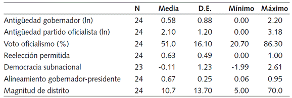 Finalmente consideramos la magnitud del distrito, hipotetizando que el control del gobernador sobre los diputados nacionales será más sencillo allí donde se elijan pocos. El indicador usado es el número total de diputados nacionales elegidos por cada provincia (Magnitud de Distrito). Se utiliza sólo en las regresiones correspondientes a los diputados, ya que el número de senadores es el mismo para todas las provincias. El cuadro 2 presenta las estadísticas descriptivas de las siete variables independientes descritas.