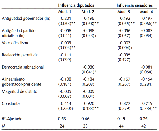 Esta sección explora los determinantes de la varianza en el nivel de influencia que los gobernadores ejercen sobre los legisladores. Para ello llevamos a cabo un análisis de regresión múltiple de las variables dependientes Influencia Diputados e Influencia Senadores sobre una serie de variables explicativas teóricamente relevantes.