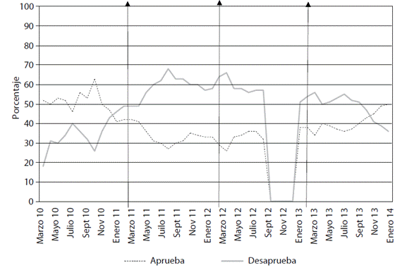 El 11 de marzo de 2010, Piñera asumió la presidencia. Días después de un terremoto, su gobierno inició su cuatrienio con 52 por ciento de aprobación -de acuerdo con datos mensuales de Adimark-. Como muestra la gráfica 1, la aprobación de Piñera se mantuvo sobre 50 por ciento en los primeros cien días de gobierno. Pocos meses después, el presidente alcanzó un pico de 63 por ciento, tras la tragedia que mantuvo atrapado durante dos meses a 33 mineros. Finalizado el primer año, comenzó una etapa marcada por manifestaciones sociales, entre las que destacó el movimiento estudiantil, que hicieron caer la aprobación presidencial a 27 por ciento en 2011. A fines del segundo año de gobierno, se anunciaron medidas para resolver el conflicto estudiantil. Sin embargo, la aprobación no varió significativamente, promediando 34 por ciento de respaldo el último trimestre de 2011.