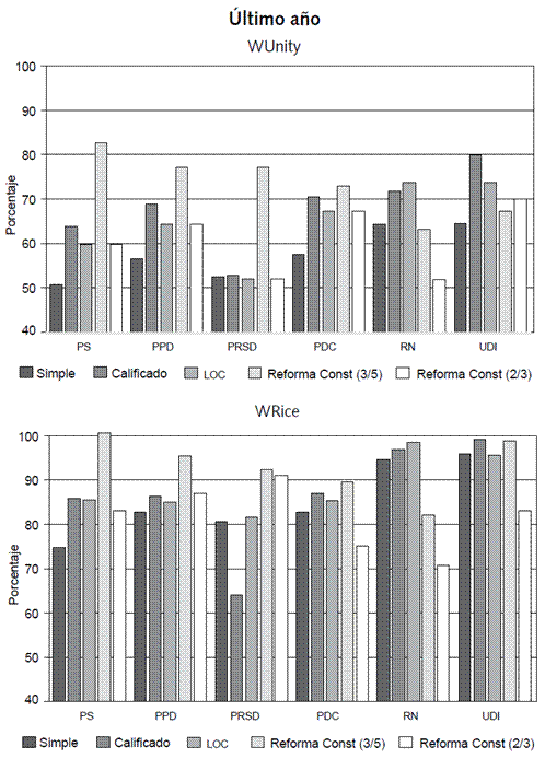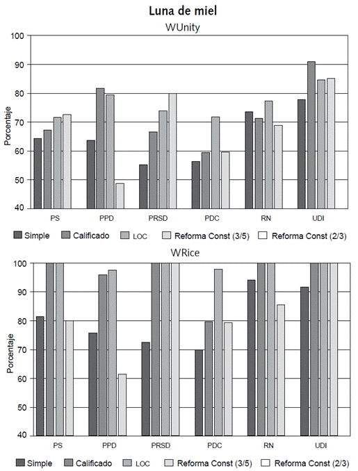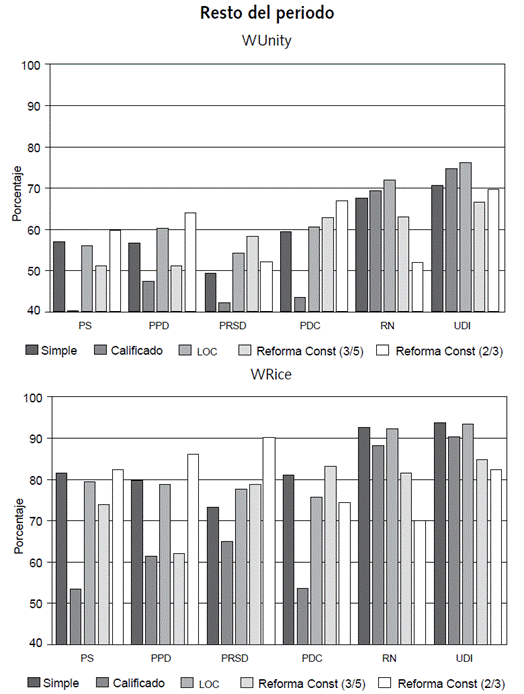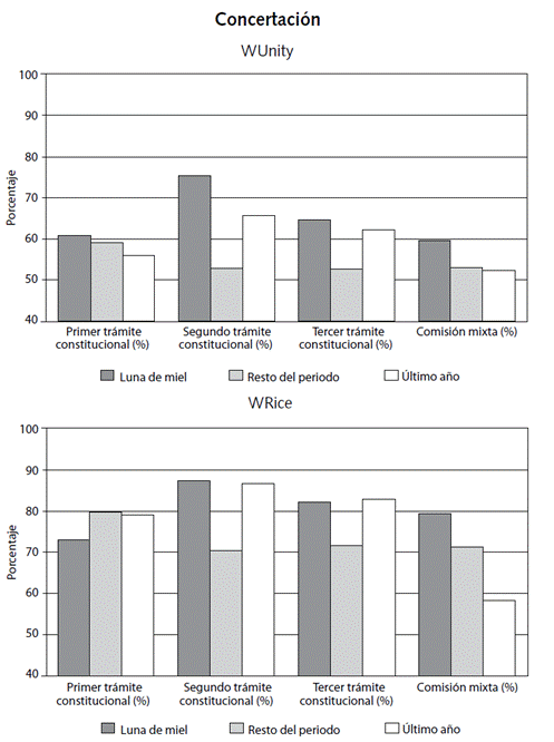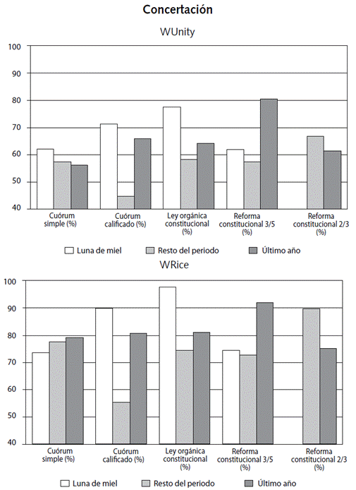 Hay diferencias entre los indicadores WUnity y WRice. Como el segundo no considera las abstenciones ni las ausencias, tiende a subestimar la indisciplina (Carey, 2007; Depauw y Martin, 2009). Por ejemplo, si un partido lo integran 50 miembros, y de éstos 20 votan a favor y 30 se abstienen o se ausentan, WRice mostrará disciplina perfecta, pese a que los ausentes pudieron haberse ausentado precisamente porque no querían votar igual que el resto del partido. En cambio, WUnity considera a todos los legisladores. Cuando hay ausencias y abstenciones de un legislador, se considera que ese legislador votó en contra de la posición mayoritaria del partido. Usando el ejemplo anterior, el resultado de WUnity sería de 0.4, o 40 por ciento. Por cierto, si los 50 votan de la misma forma, ya sea a favor o en contra, el indicador WUnity reflejaría disciplina perfecta, con un valor de 100 por ciento. Los índices WRice y WUnity los construimos siguiendo la fórmula convencional explicada en Carey (2007, p. 115). Las bases de datos están disponibles para los que deseen replicar nuestros resultados.