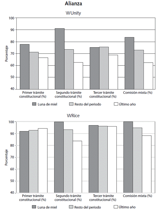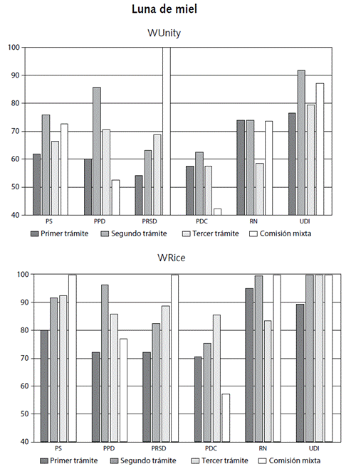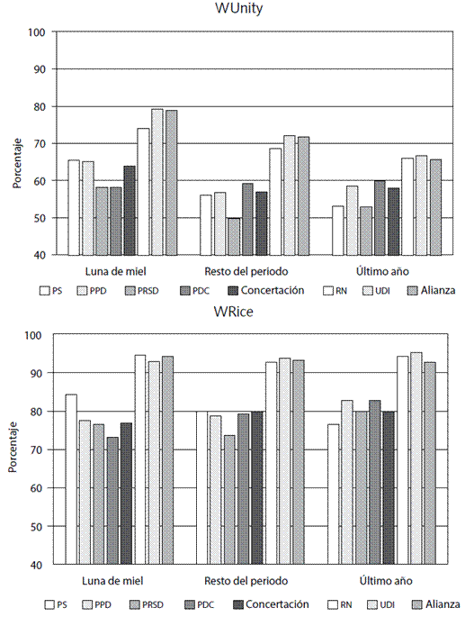 Todos los partidos de la oposición presentaron menor disciplina que los del oficialismo. El PDC y el PRSD fueron los partidos menos disciplinados en la Concertación (aunque el PRSD es el partido con menos escaños, por lo que la indisciplina de uno de sus diputados pesa más que la indisciplina de un diputado de PS o PPD). La oposición mostró su mayor disciplina en la luna de miel. No hay grandes diferencias en la disciplina de los partidos de oposición en el resto del periodo y el último año. Como muestra la gráfica 4, la evolución en la disciplina de los partidos varía dependiendo de si se observa el indicador WUnity o WRice. Cuando se usa WUnity, los partidos son más disciplinados en la luna de miel. Al observar WRice, los partidos son igualmente disciplinados en todas las etapas. Esto probablemente resulta del hecho de que las ausencias aumentan en las votaciones a medida que avanza el periodo legislativo, por lo que la indisciplina parecería aumentar. Ahora bien, podría ser que cuando los legisladores están inclinados a votar de forma diferente a sus partidos, simplemente optan por no asistir, por lo que la disciplina entre los que votan es alta (de acuerdo a WRice) pero es más baja si se incluye a los legisladores que se ausentan (según WUnity).