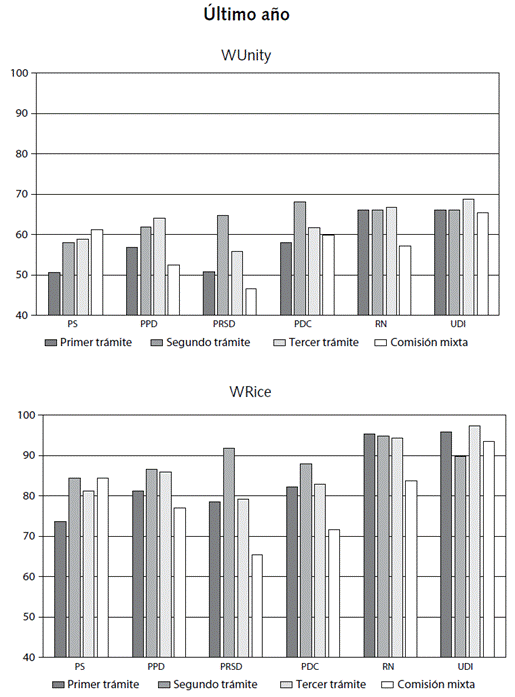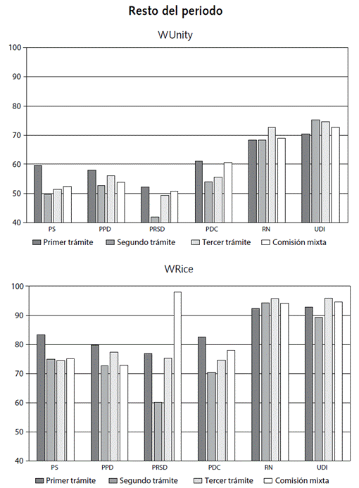 La gráfica 4 revela los índices de disciplina por coalición y partido político usando los dos indicadores, WUnity y WRice. La disciplina en la Alianza es mayor que en la Concertación. La disciplina del oficialismo es mayor durante los primeros cien días que en el resto del periodo y, considerablemente superior que en el último año. La UDI es el partido más disciplinado, superando incluso a RN, el partido del presidente Piñera, que ocupa el segundo lugar en disciplina. Este fenómeno se condice con lo que reporta Martínez (2014), sobre el partido de la presidenta Bachelet, el PS, que fue el segundo conglomerado más disciplinado en la Cámara.
