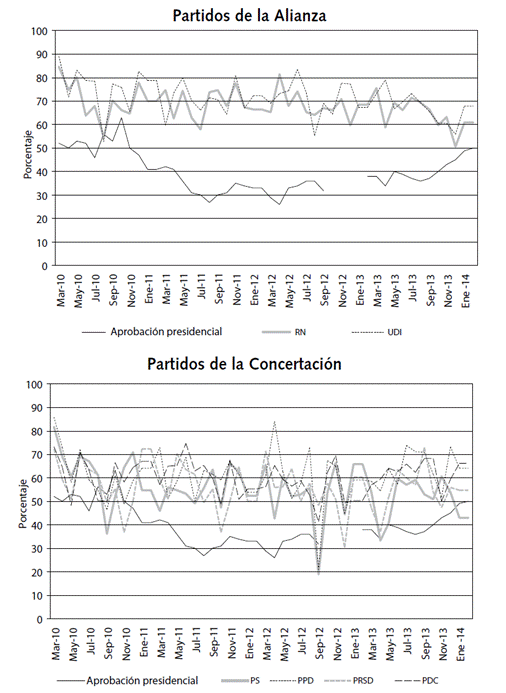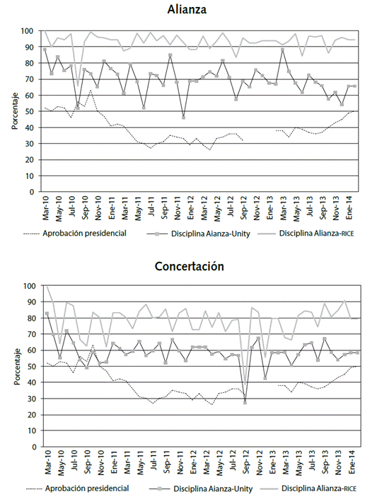 Desde 1990 a 2010 el Poder Ejecutivo en Chile estuvo en manos de la Concertación. Durante el cuatrienio de Bachelet, la Cámara de Diputados tuvo también mayoría de legisladores del mismo sector. Los estudios que subrayan una mayor disciplina de la Concertación que de la Alianza en el periodo no pueden distinguir si esa disciplina se debió a que la centro-izquierda es más disciplinada per se o a que esa coalición controlaba el Ejecutivo. Pero los resultados del periodo 2010-2014, que muestra una mayor disciplina de la Alianza, dejan en evidencia que, sin perjuicio de quién esté en el poder, la coalición oficialista es más disciplinada que la oposición.