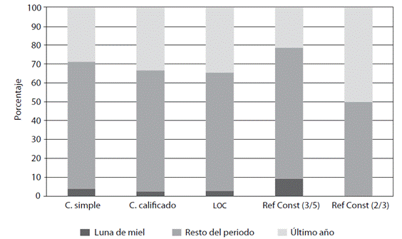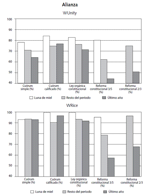 En votaciones sobre leyes de cuórum calificado y Ley Orgánica Constitucional, la Alianza es más disciplinada. Este fenómeno se evidencia durante la luna de miel, cuando el gobierno goza de un mayor poder de maniobra en el Congreso. Lo opuesto ocurre en etapas finales, cuando la disciplina de la Alianza registra los menores índices, particularmente en votaciones de reforma constitucional. Esto confirma parcialmente nuestra segunda hipótesis, el oficialismo es más disciplinado en votaciones de proyectos de ley que requieren cuórums más elevados.