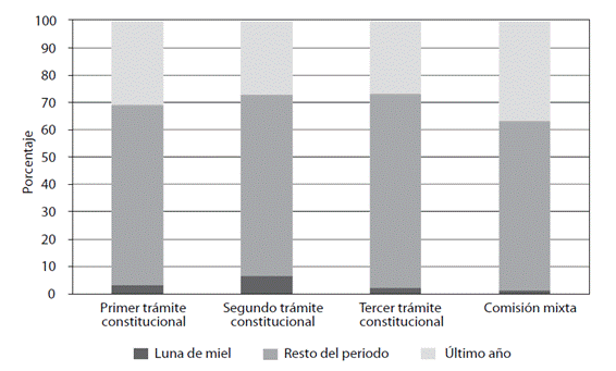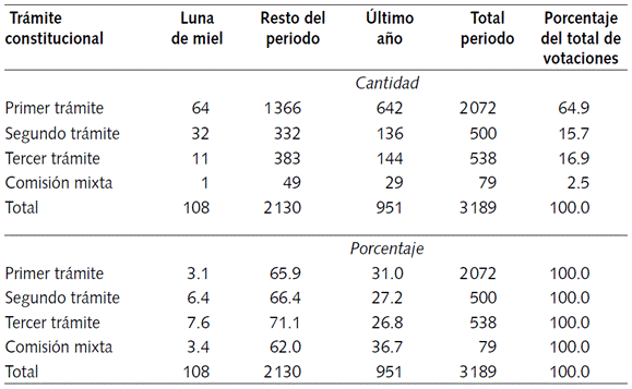 El cuadro 7 muestra las votaciones según el trámite constitucional. Hay un peso menor de las votaciones en primer trámite en la luna de miel, en tanto el gobierno apenas comenzaba a enviar sus proyectos de ley al Congreso. A su vez, hay un peso mayor de las votaciones en comisión mixta en el último año, ya que el gobierno buscaba promulgar varias leyes antes de dejar el poder y, para ello, forzó la votación en tercer trámite aun cuando eso significaba que la versión aprobada por la Cámara revisora era diferente a la aprobada por la primera Cámara, lo que obligaba a enviar el proyecto a comisión mixta.
