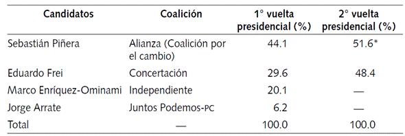 Morales y Sánchez (2010) sostienen que el triunfo de la derecha responde a la consistente unidad entre la Unión Demócrata Independiente (UDI) y Renovación Nacional (RN), el creciente apoyo en las zonas de bajos recursos y el aumento de la adhesión en los segmentos más jóvenes de la población. A diferencia de los comicios presidenciales de 2005, cuando la Alianza tuvo dos candidatos, en 2009 tuvo candidato único. Esta decisión fue clave en convencer a una mayoría de los electores sobre la conveniencia de votar por la alternancia en el poder. El cuadro 1 presenta los resultados electorales tanto en la primera vuelta como en la segunda vuelta presidencial. Piñera superó ampliamente al resto de los candidatos en primera vuelta (44.1%).