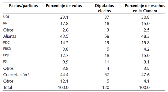 En la elección legislativa de 2009, celebrada simultáneamente con la primera vuelta de la elección presidencial, la Alianza (entonces llamada Coalición por el Cambio) estuvo integrada por la UDI y RN. La Concertación quedó conformada por el Partido Demócrata Cristiano, el PS, el Partido Radical Social Demócrata, el Partido por la Democracia y -por primera vez desde 1989- por el PC. Adicionalmente, hubo otros pactos menores. El cuadro 2 muestra los porcentajes de votos que obtuvieron los pactos y partidos con los respectivos escaños ganados y el porcentaje de representación en la Cámara.