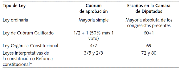 La variable cuórum legislativo se construye con base en los umbrales mínimos de votación estipulados en la Constitución. El cuadro 3 resume los tipos de ley y los cuórums que se requieren para que un proyecto sea aprobado en el Congreso.