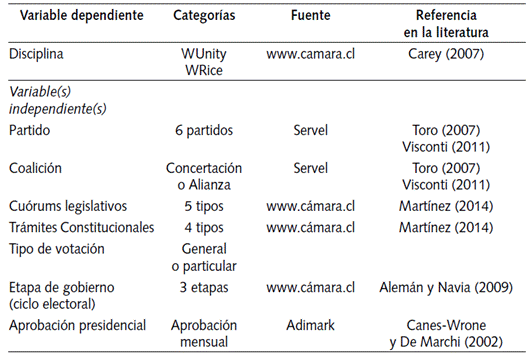 Nuestra variable dependiente es disciplina partidista en las votaciones en sala. Las variables independientes son la militancia del legislador (partido o coalición), el tipo de cuórum (mayoría requerida para aprobar una ley), trámite constitucional, tipo de votación, calendario electoral y aprobación presidencial.