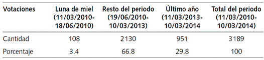 Como la teoría sugiere que el ciclo electoral afecta la capacidad del presidente de avanzar su agenda e inducir disciplina legislativa, dividimos el cuatrienio en tres periodos. Primero, la luna de miel, que por tradición se considera ya sea como los cien primeros días de gobierno o como el primer año. Aquí optamos por los cien primeros días, en tanto el Ejecutivo en Chile se esmera en lograr que sus iniciativas sean aprobadas antes del primer mensaje a la nación, cuestión que por mandato constitucional ocurre el 21 de mayo, poco más de dos meses después de asumido el poder. Por eso, consideramos las votaciones realizadas entre el 11 de marzo y el 18 de junio de 2010 como parte de la luna de miel. En este periodo se realizaron 3.4 por ciento del total de votaciones. Si usáramos el método alternativo de luna de miel y consideráramos todas las votaciones realizadas durante el primer año, este periodo comprendería 664 votaciones (20.8% del total de votaciones). La razón del tipo de votos -por cuórum y trámite legislativo- no varía sustancialmente si usamos como luna de miel los primeros cien días o el primer año. La segunda etapa es el resto del periodo, que comprende las votaciones realizadas entre el 19 de junio de 2010 y el 10 de marzo de 2013. Esto representa 66.8 por ciento del total de votaciones. La tercera etapa es el último año, que considera las votaciones realizadas entre el 11 de marzo de 2013 y el 10 de marzo de 2014 que corresponden al último año (29.8% de las votaciones). El cuadro 5 muestra las votaciones por periodo de gobierno.