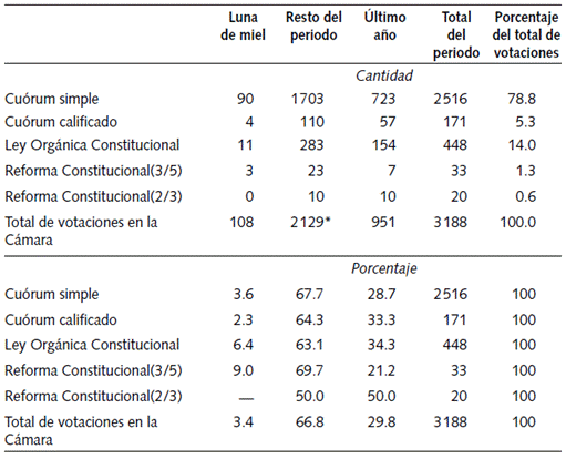 El cuadro 6 muestra las votaciones de acuerdo con el cuórum (o mayoría) requerido para la aprobación. En términos relativos, la distribución de votaciones de acuerdo con distintos cuórums no sufre grandes modificaciones. El hecho de que no hubiera ninguna votación de reforma constitucional que requiriera mayoría de 2/3 y que hubiera un poco más de votaciones sobre reforma constitucional que requerían mayoría de 3/5 tiende a distorsionar la percepción. Pero en general, las votaciones por distintos tipos de cuórums se distribuyeron de forma similar en las tres etapas del gobierno.