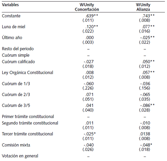 Para evaluar el efecto combinado de todas las variables independientes sobre la disciplina partidista en la votación en sala, el cuadro 8 muestra los resultados de una regresión de mínimos cuadrados ordinarios (OLS por sus siglas en inglés). La variable dependiente es la disciplina medida en el indicador WUnity. Calculamos el indicador WUnity para cada coalición en las 3 189 votaciones realizadas en el periodo. Para determinar qué explica la disciplina, usamos como variables independientes los periodos del gobierno, el tipo de cuórum, si la votación fue en general o en particular, el trámite constitucional y el resultado de la votación. Como estas variables son categóricas, excluimos un valor por cada una de las variables dummy.