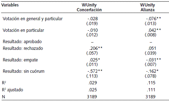 El cuadro 4 resume las variables independientes y dependientes que utilizamos en el análisis de las 3 189 votaciones realizadas en la Cámara de Diputados entre 2010 y 2014.