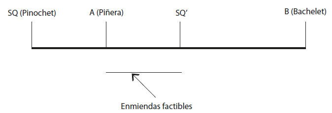 El statu quo (SQ) es la Constitución de Pinochet modificada con 43 enmiendas. La presidenta Michelle Bachelet quiere modificaciones más sustantivas que el presidente electo Sebastián Piñera, quien apoya “perfeccionar” la Constitución. Si suponemos que ambos jugadores aceptarán una solución más cercana a sus puntos ideales que al SQ, entonces las soluciones factibles se presentan en el diagrama 1. El fracaso de Bachelet incluso de presentar (ya no digamos de hacer) las reformas constitucionales que deseaba, junto con la victoria electoral de Piñera, significan que el que establece la agenda del juego constitucional ahora es el jugador A y no el jugador B. Mientras que el jugador B presumiblemente haría una oferta a la izquierda del intervalo de la solución factible (cerca de SQ), el jugador A podría hacer una oferta cercana al lado derecho del intervalo (punto A). Por supuesto, el que establece la agenda también podría hacer una propuesta en otro punto en medio del intervalo y ganarse la simpatía del otro lado.