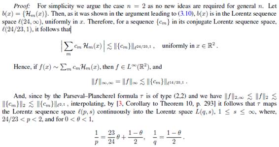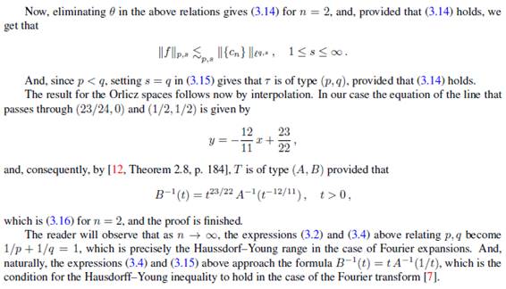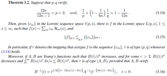 A companion result to the Hausdorff-Young inequality addresses under what conditions fcmg is the sequence of Fourier coefficients of a function f in the Hausdorff-Young range [2], [15, Vol.2, Theorem 2.3, p, 101]. For the Hermite expansions in R, this is done in [4, Theorem 4.2].