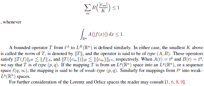 A linear operator T defined for f ∈ LA() and taking values T(f) = {cm} in lB is said to be bounded if there is a constant K>0 such that