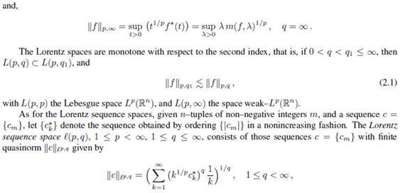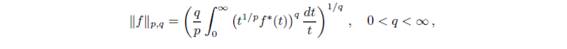 The Lorentz space Lp,q() = L(p, q), 0 < p < ∞, 0 < q ≤ ∞, consists of those measurable functions f with finite quasinorm given by