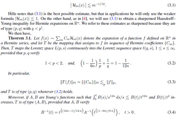 Abstract: We discuss a sharpened Hausdorff–Young inequality for n-dimensional Hermite expansions.
