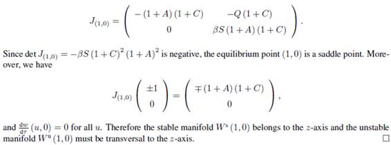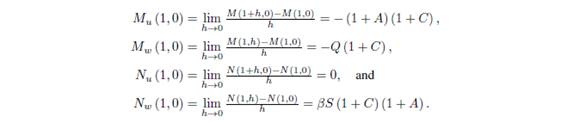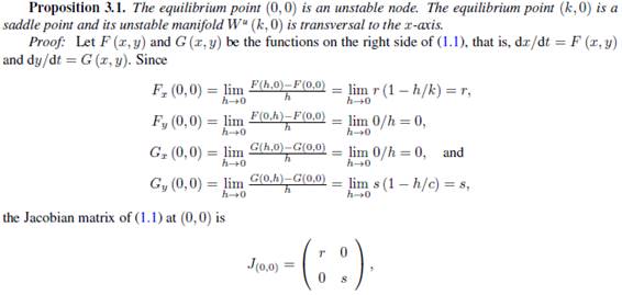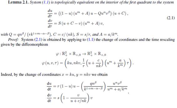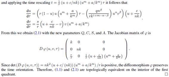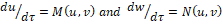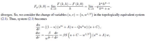 and the equilibrium point (k, 0) in the new coordinates is (1,0). If we denote by M(u,v) and N(u,v) the functions on the right side of the above equations, that is,
