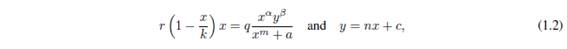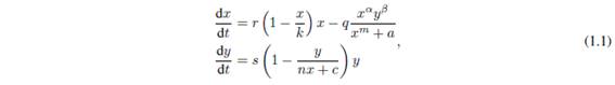 where x (t) and y (t) represent respectively the prey and predator population size at the positive time t, and with ecological parameters (see Table 1.1) satisfying