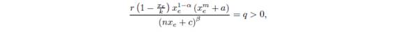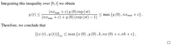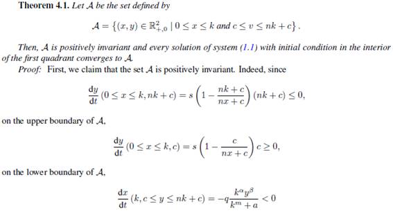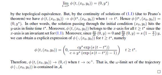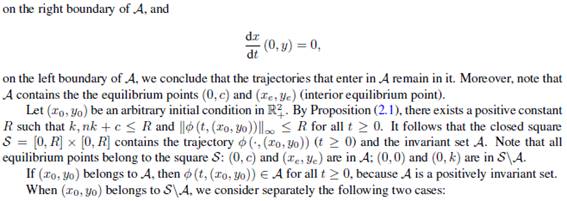 less than 1. Therefore the analysis must be careful. We can expect uniqueness of solutions only in the interior of the first quadrant. The equilibrium points of (1.1) are: (0; 0), (k; 0), and (0; c) over the coordinate axes, and (xe; ye) satisfaying the isocline equations