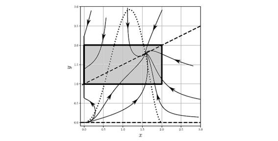 . The set A is given by the gray rectangle. The isoclines are in dotted and dashed lines.