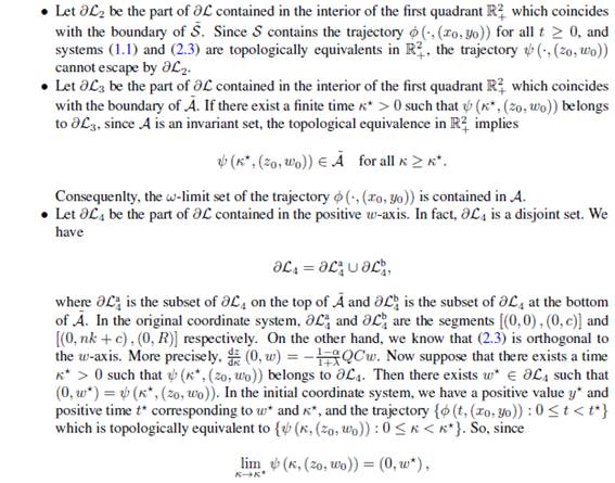 In order to simplify the calcualations, a reparameterization and a time rescaling were made, obtaining the topologically equivalent system (2.1). Using this, we proved that our original system is topollogically equivalent (on the interior of the first quadrant) to a new differentiable system ((2.2) for and (2.3) for . Also, the nature of boundary equilibrium points was explored. Finally, the Poincaré-Bendixon theorem and geometrical arguments were applied to the differentiable system (2.2)-(2.3) to obtain our main result. Two cases were examined separately,
