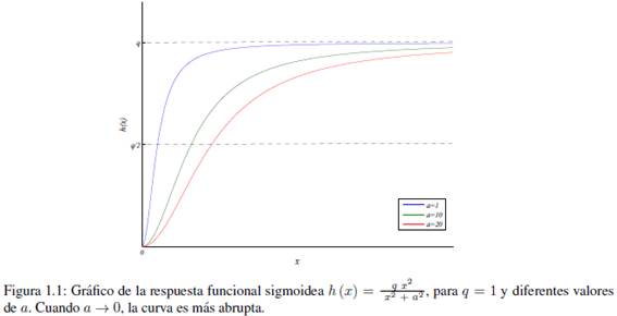 La función , es saturada pues , donde el parámetro a es una medida de la abrupticidad [6] de la respuesta funcional. Si , la curva crece rápidamente, mientras que si, la curva crece lentamente, es decir, se necesita mayor cantidad de presas para obtener (Ver Figura 1.1 ).