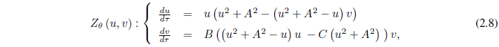 Este modelo se expresa mediante el sistema autónomo de ecuaciones diferenciales bidimensionales no lineales siguiente