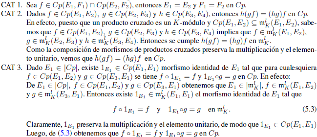 Ejemplo 5.3. Cp es una categoría, cuyos objetos son productos cruzados de Hopf, cuyos morfismos son morfismos de productos cruzados y el producto de sus morfismos es la composición de aplicaciones.